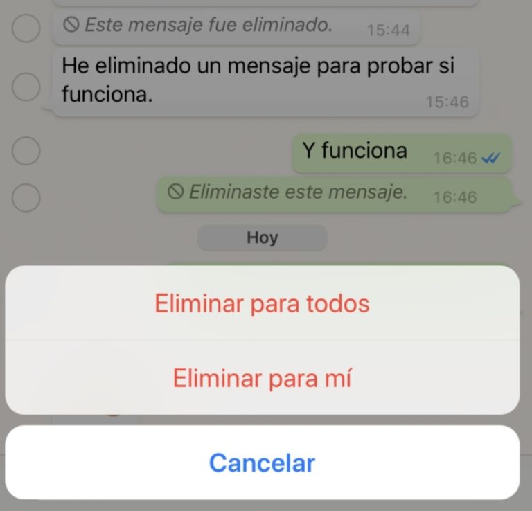 Lo que no se puede ocultar es que los mensajes que se enviaron han sido eliminados, pues aún cuando lo que se dijo desaparece, dentro de la conversación queda un 'Este mensaje fue eliminado', por lo que la otra persona notará lo que sucedió.