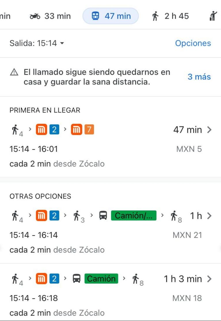 - Se desplegará una fila de rutas recomendadas. Asimismo, indica desde dónde tomar el servicio y la hora estimada de llegada. Podrás adaptar la hora de salida según tus necesidades ¡Y listo!