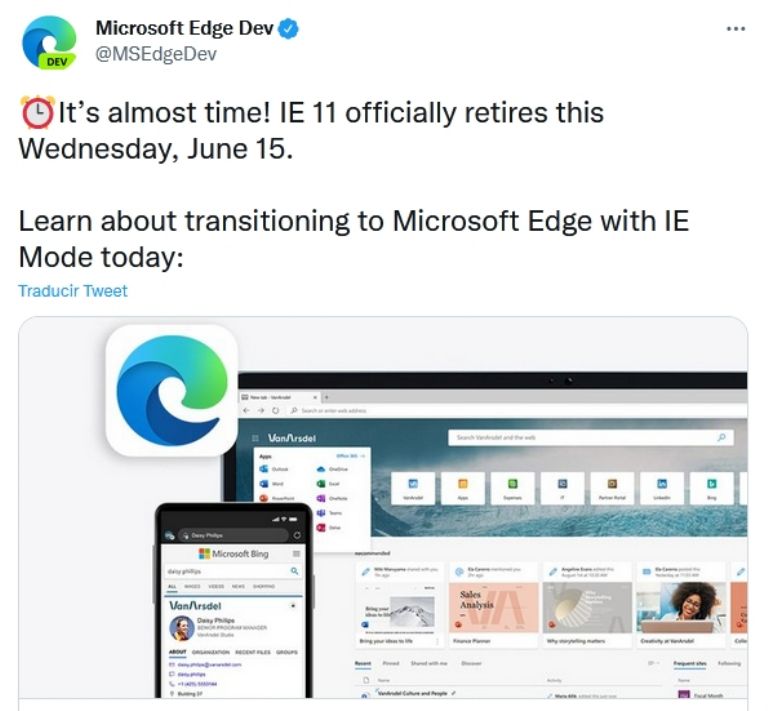Aunado a esto, explicaron que Microsoft Edge ofrece mayor seguridad y es más moderno que su predecesor, lo cual le ayuda a tener una mejor compatibilidad con sitios web y aplicaciones. Se dijo que será a partir de este miércoles 15 de junio que Internet Explorer dé el paso a su sucesor como el principal navegador: "¡Casi es la hora! IE 11 se retira oficialmente este miércoles 15 de junio. Obtenga información sobre la transición a Microsoft Edge con el modo IE hoy", precisó la compañía.