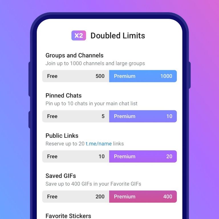 También se podrán crear hasta mil canales, 20 carpetas de chats con hasta 200 conversaciones cada una, añadir una cuarta cuenta, fijar 10 chats y guardar 10 stickers favoritos, biografías más largas, hasta 400 GIFs favoritos y 20 enlaces públicos reservados. Otras novedades Premium es que los mensajes de voz se podrán convertir en texto, nuevas animaciones para stickers y pantalla completa, reacciones únicas, herramientas adicionales para gestionar chats, fotos de perfil animadas, distintivos de verificación "premium", íconos especiales para la app en la pantalla de inicio y no tendrá anuncios en los países donde aparecen mensajes patrocinados.