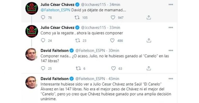 Chávez no tardó en responder afirmando que él hubiera derrotado a Floyd Mayweather en las 140 libras, por lo que Faitelson respondió que se basaba en lo que sucedió ante Pernell Whitaker, a lo que el expúgil no soportó y explotó pidiéndole que "no dijera ma..."