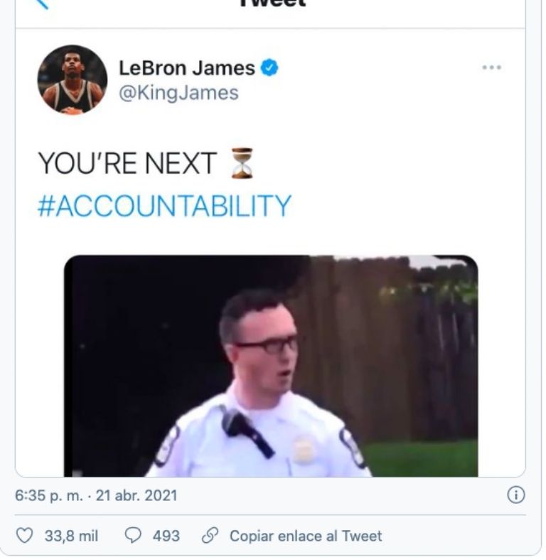 Los Ángeles, California.- En el marco del veredicto contra el policía Derek Chauvin acusado del asesinato del afroamericano George Floyd, LeBron James, jugador de Los Ángeles Lakers, publicó una foto del policía que disparó contra Ma'Khia Bryant, la menor de edad de 16 años que perdió la vida.
