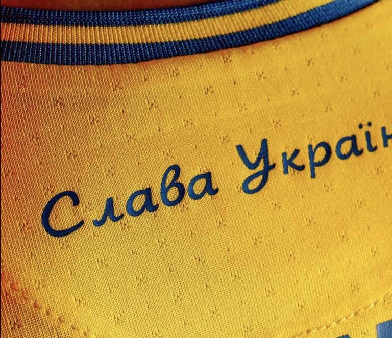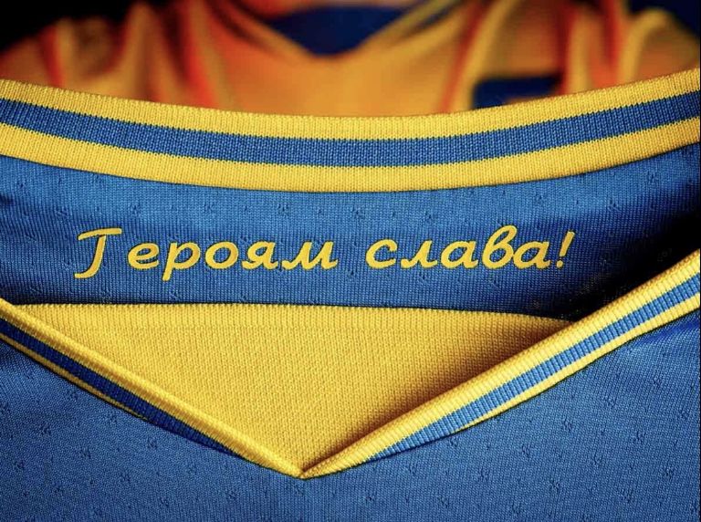 Además, las equipaciones tienen los eslóganes "¡Gloria a Ucrania! ¡Gloria a los héroes!", haciendo referencia a un canto patriótico convertido en grito de unión de los manifestantes que habían derrocado a un presidente apoyado por el Kremlin, Viktor Yanukovich, en un levantamiento popular en 2014.