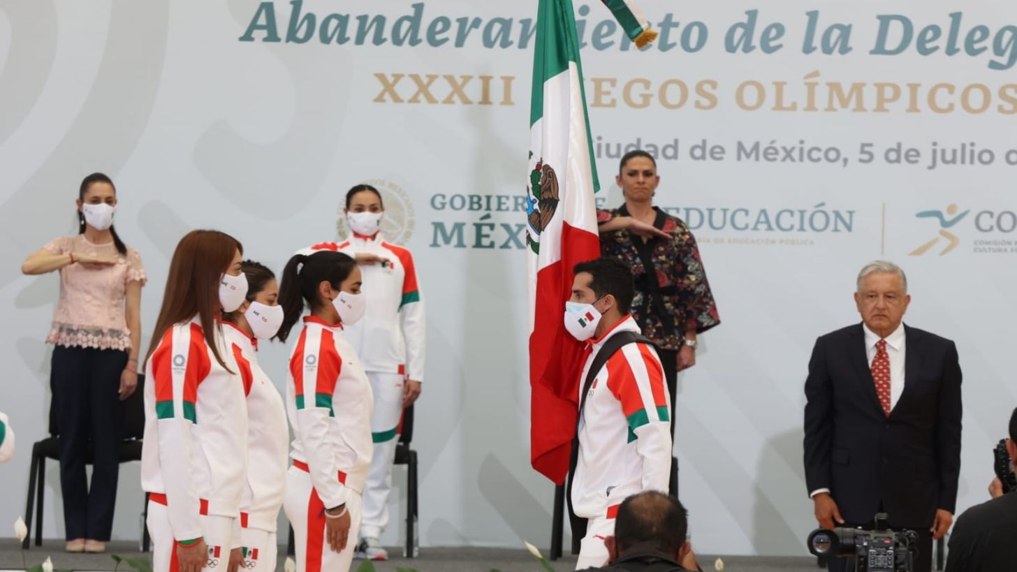 Ciudad de México, México.- El presidente Andrés Manuel López Obrador abanderó a la delegación mexicana que asistirá a los Juegos Olímpicos Tokio 2020 y anunció que habrá un estímulo económico para todos los integrantes que asistan, incluidos cuerpos multidisciplinarios, además de que habrá una recompensa especial para quienes suban al podio.