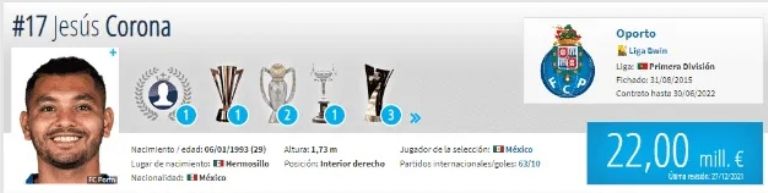 Ciudad de México.- Aunque ha perdido protagonismo con el Porto, el sonorense Jesús Manuel Corona sigue siendo una pieza cotizada al colocarse como el segundo jugador más valioso en su posición.