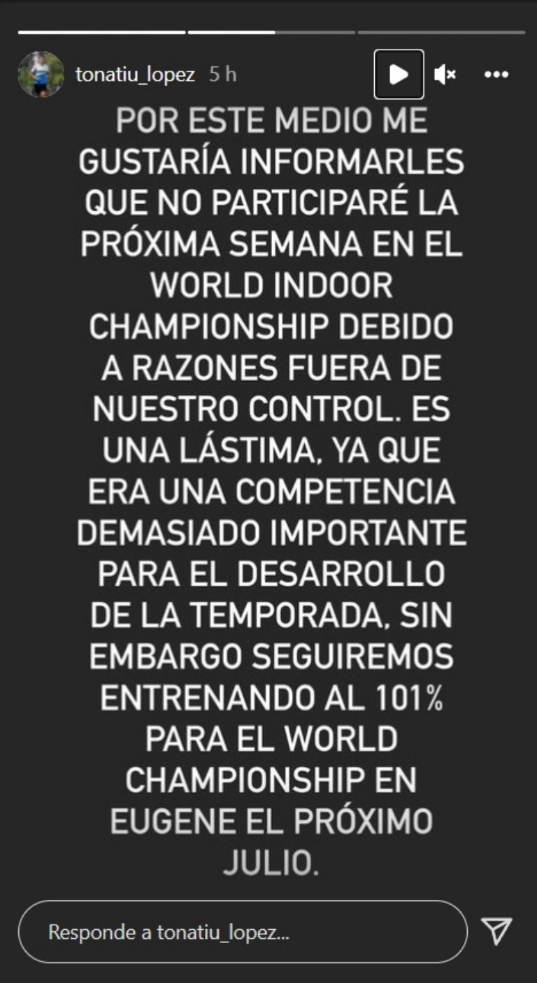 Es una lástima ya que era una competencia demasiado importante para el desarrollo de la temporada, sin embargo, seguiremos entrenando al 101 por ciento para el World Championship en Eugene el próximo julio", dijo el hermosillense a través de sus historias.