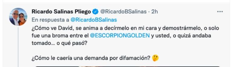 “¿Cómo ve David, se anima a decírmelo en mi cara y demostrármelo, o solo fue una broma entre el @ESCORPIONGOLDEN y usted, o quizá andaba tomado… o qué pasó? ¿Cómo le caería una demanda por difamación?”, sentenció.