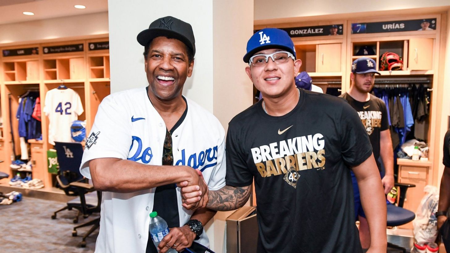 Denzel Washington visitó el clubhouse del equipo angelino, conviviendo con los jugadores, entre ellos el sinaloense, quienes posaron junto al actor ganador del Oscar.