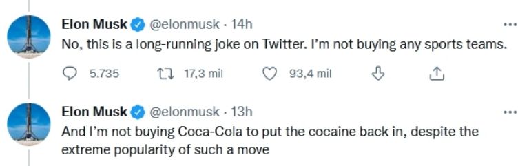 Justo después, el dueño de Tesla y SpaceX, afirmó que "compraré el Manchester United, de nada"; este anuncio causó un gran revuelo entre los internautas, quienes al recordar lo que sucedió con Twitter, se preguntaron si uno de los hombres ricos del mundo hablaba en serio o no. Finalmente, tras obtener casi 500 mil 'me gusta' unas horas después, y con las preguntas de numerosos seguidores, el empresario aclaró que era una broma.