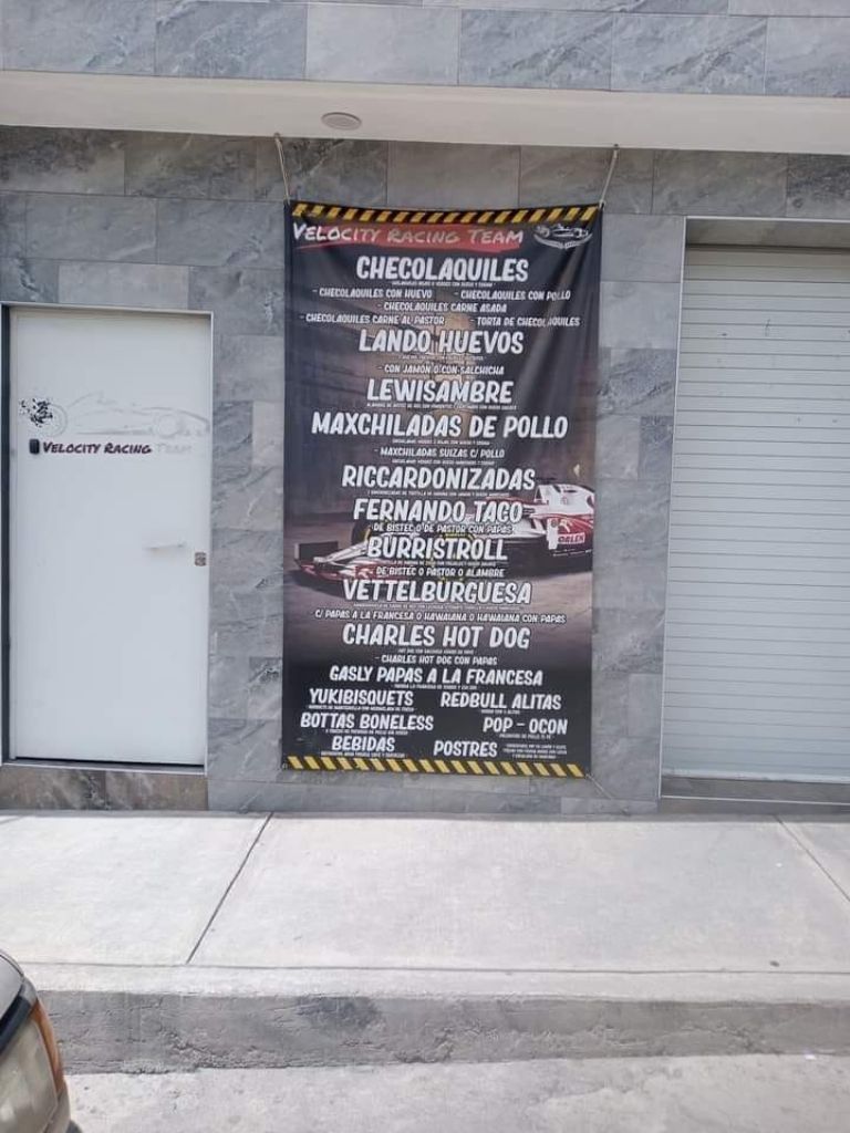 Se trata del establecimiento 'Velocity Racing Pits', que cuenta con diferentes platillos para ofrecer a sus comensales, aunque lo curioso es que los nombres de los alimentos son un juego de palabras con los nombres de los diferentes pilotos del circuito, desde el mexicano Sergio 'Checo' Pérez hasta su compañero Max Verstappen, Lewis Hamilton, entre otros. En honor al tapatío, podemos encontrar unos ricos chilaquiles, o más bien 'Checolaquiles', los cuales pueden ser verdes o rojos, y acompañarse con huevo, pollo o hasta carne asada, al pastor o en una torta, por un precio de entre 40 a 70 pesos.