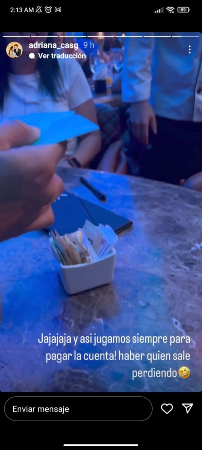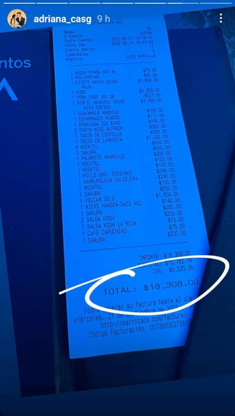Se desconoce si fue el mismo futbolista quien pagó la larga cuenta, pues Adriana compartió que otras tres personas pusieron sus respectivas tarjetas sobre la mesa y el mesero fue quien eligió la que usaría para saldar el total del consumo: "Jajajaja y así jugamos siempre para pagar la cuenta. A ver quién sale perdiendo", compartió la pareja del 'Chicote' en el video que publicó.