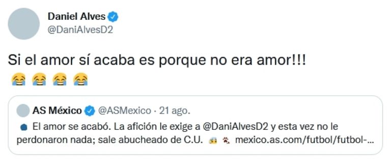 Ahora, Alves recurrió a redes sociales para hablar sobre tema, pues en su cuenta de Twitter retuiteó una publicación de AS México, donde se puso la frase "El amor se acabó. La afición le exige a @DaniAlvesD2 y esta vez no le perdonaron nada; sale abucheado de C.U."; a esto, el jugador de 39 años respondió: "Si el amor se acaba es porque no era amor!!!", además de cuatro emojis de caritas riendo.