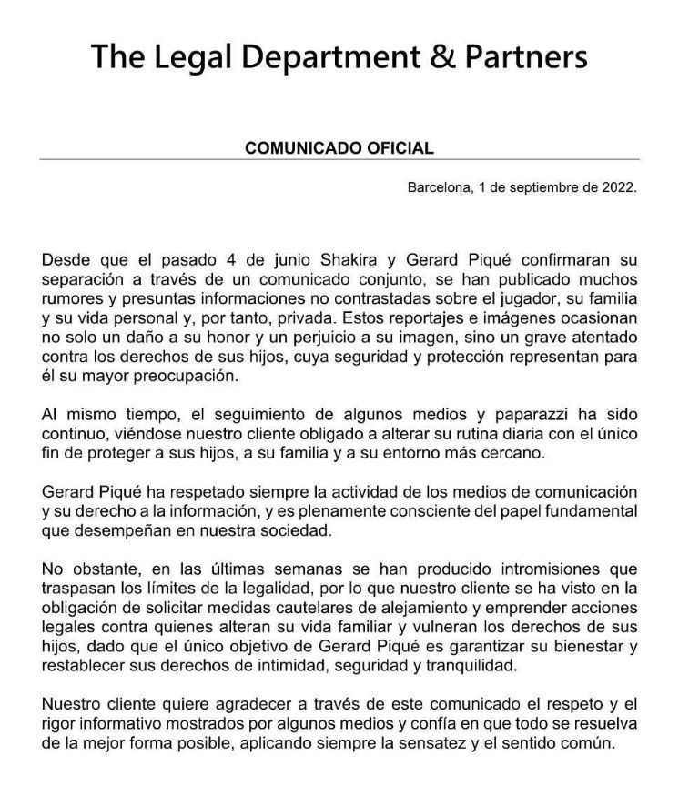 No obstante, en las últimas semanas se han producido intromisiones que traspasan los límites de la legalidad, por lo que nuestro cliente se ha visto en la obligación de solicitar medidas cautelares de alejamiento y emprender acciones legales contra quienes alteran su vida familiar y vulneran los derechos de sus hijos, dado que el único objetivo de Gerard Piqué es garantizar su bienestar y restablecer sus derechos de intimidad, seguridad y tranquilidad", concluye el comunicado.