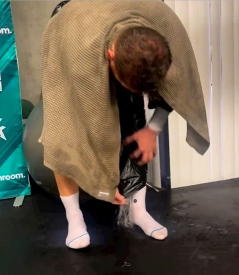 Durante el clip antes mencionado se aprecia como el campeón unificado del peso supermedio se alza el pantalón y escurre una gran cantidad de sudor y se escucha a alguien decir que perdió cinco libras, es decir, poco más de dos kilos.