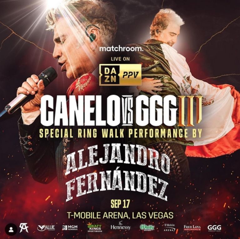 Los aficionados al 'Canelo' están acostumbrados a ver sus salidas espectaculares previas a subir al ring; en esta ocasión, será el cantante Alejandro Fernández quien lo acompañará en su camino rumbo al cuadrilátero dándole un estilo clásico de la música regional mexicana, anunció la promotora de la pelea, Matchroom Boxing, quien confirmó que el intérprete de 'Como quien pierde una estrella' estará junto a Álvarez para el ringwalk.