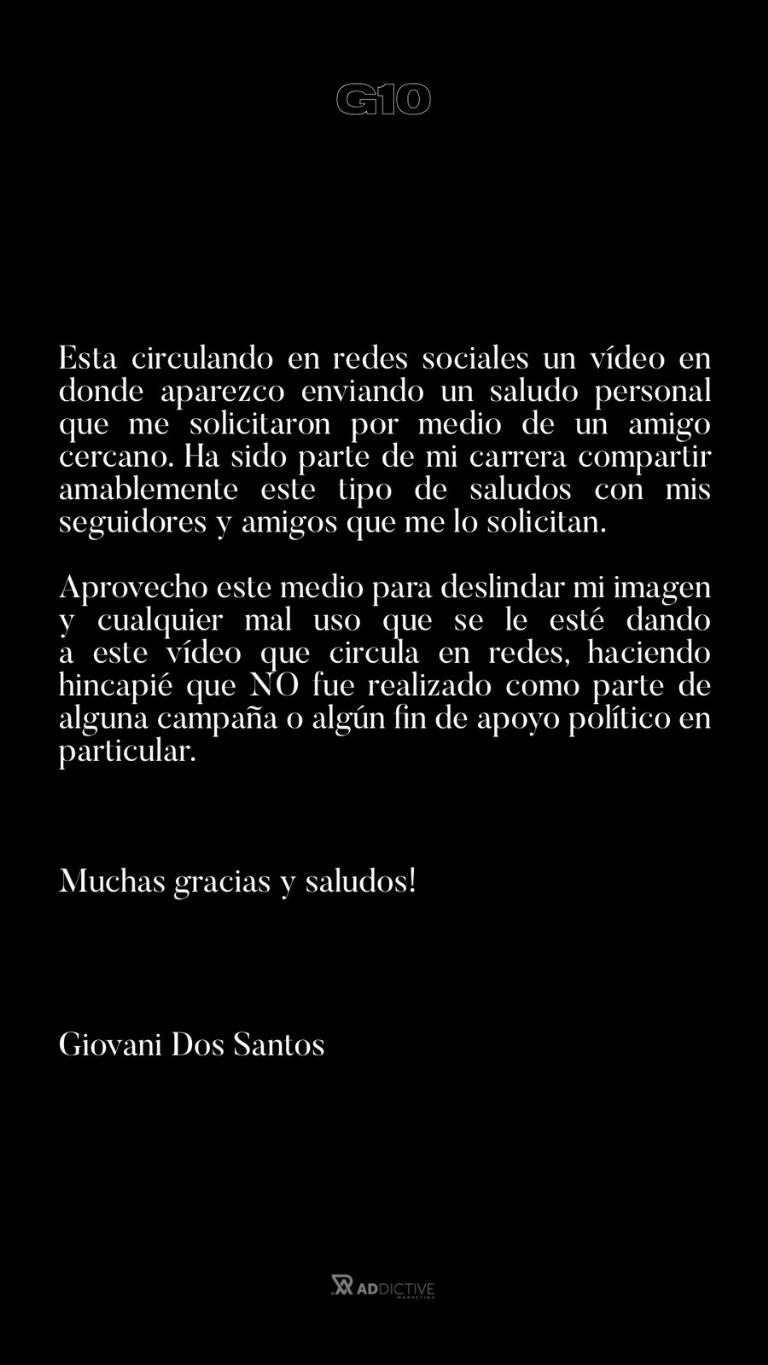“Aprovecho este medio para deslindar mi imagen y cualquier mal uso que se le esté dando a este video que circula en redes, haciendo hincapié que no fue realizado como parte de alguna campaña o algún fin de apoyo político particular”, agregó Gio después de que se hiciera viral un mensaje en el que expresa: "Secretario Adán, ¿cómo estás? Soy Giovanni Dos Santos y estoy muy a gusto con su amistad. Le mando un fuerte abrazo".