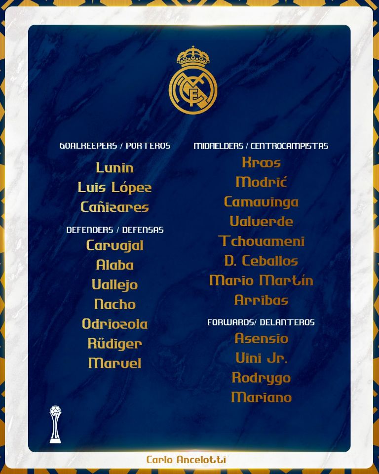 El equipo merengue viajó con 22 jugadores entre los que destaca la ausencia de Thibaut Courtois en la portería. El belga sintió molestias previo al partido contra el Mallorca y no se alcanzará a recuperar para el torneo. Aunque aún no se sabe el alcance de su lesión, la zona afectada todavía estaba inflamada y tendrán que esperar para realizar los estudios correspondientes, según informaron medios españoles, por lo que no se arriesgaron.