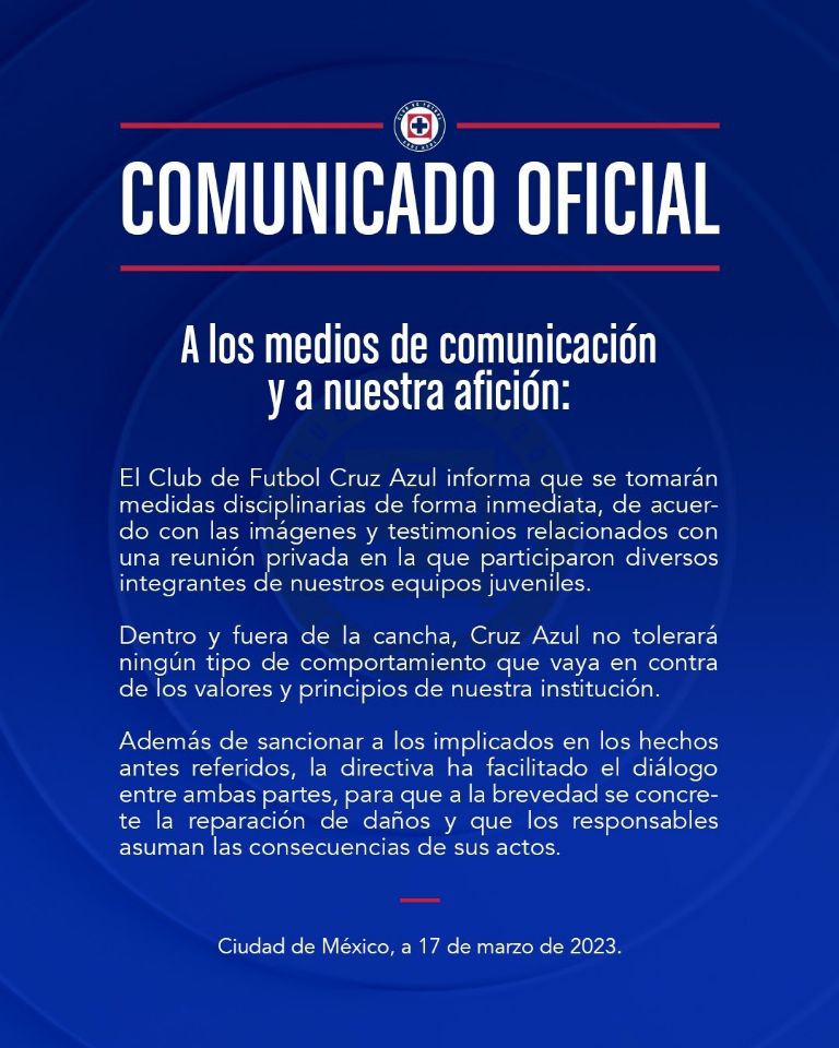 "El Club de Futbol Cruz Azul informa que se tomarán medidas disciplinarias de forma inmediata, de acuerdo con las imágenes y testimonio relacionados con una reunión privada en la que participaron diversos integrantes de nuestros equipos juveniles. Dentro y fuera de la cancha, Cruz Azul no tolerará ningún tipo de comportamiento que vaya en contra de los valores y principios de nuestra institución.