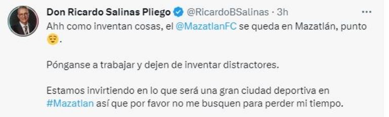 Incluso, el actual dueño del equipo anunció que se encuentran invirtiendo en una ciudad deportiva por lo que queda descartada la posibilidad de que regresen a Michoacán. "Ahh como inventan cosas, el Mazatlán FC se queda en Mazatlán, punto. Pónganse a trabajar y dejen de inventar distractores. Estamos invirtiendo en lo que será una gran ciudad deportiva en Mazatlán así que por favor no me busquen para perder mi tiempo", escribió Salinas Pliego en su cuenta de Twitter.