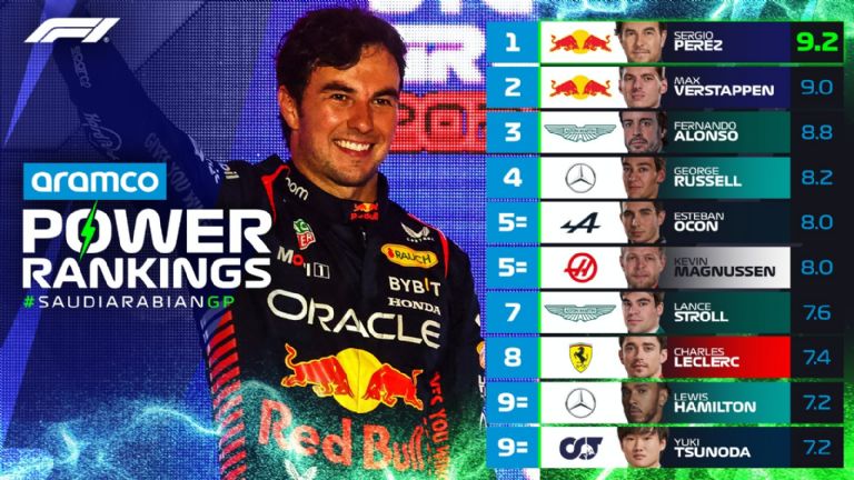 Con un 9.2 de calificación, el mexicano se quedó en el primer puesto, seguido de su compañero de equipo quien recibió un nueve cerrado por parte de los jueces. Entre los logros del mexicano en el circuito de Jeddah, los jueces destacaron su triunfo, su pole position, así como el haberse repuesto después de perder la primera posición de la carrera en la salida contra el español Fernando Alonso, así como los embates de Verstappen.