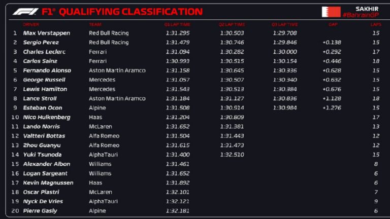 'Checo' Pérez hizo un tiempo de 1:29.846 quedando 0.138s abajo de Max Verstappen, quien con un tiempo de 1:29.708 se quedó con la primera pole position de la temporada y la número 21 de su carrera. Atrás de ellos quedaron los pilotos de Ferrari, Charles Leclerc y Carlos Sainz. El top cinco lo completó Fernando Alonso de Aston Martin que se ha mostrado como una de las sorpresas previo al inicio de la campaña.