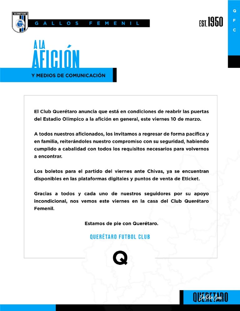 "El Club Querétaro anuncia que está en condiciones de reabrir las puertas del Estadio Olímpico a la afición en general, este viernes 10 de marzo. A todos nuestros aficionados los invitamos a regresar de forma pacífica y en familia, reiterándoles nuestro compromiso con su seguridad, habiendo cumplido a cabalidad todos los requisitos necesarios para volvernos a encontrar", informó el club en un comunicado.