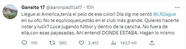 En Twitter, Padilla, quien durante el mejor momento de su carrera llegó a militar en las Águilas, recordó cuando en una ocasión se pintó el cabello de la misma manera que ahora lo hizo Reyes, y compartió que en ese entonces se llevó una llamada de atención por parte de Luis Roberto Alves 'Zague'. “Llegué al América, tenía el pelo de ese color. Día siguiente me sentó Zague en su oficina: ‘No te equivoques, estás en el club más grande' mencionó.
