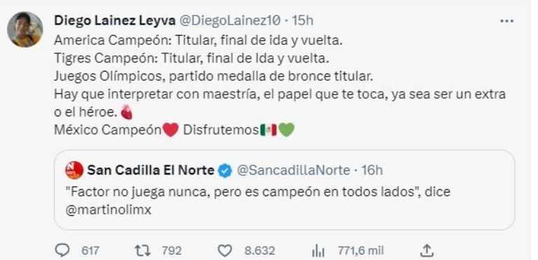 "América Campeón: Titular, final de ida y vuelta. Tigres Campeón: Titular, final de Ida y vuelta. Juegos Olímpicos, partido medalla de bronce titular. Hay que interpretar con maestría, el papel que te toca, ya sea ser un extra o el héroe. México Campeón. Disfrutemos", escribió Lainez en su cuenta de Twitter en busca de demostrar que sí ha sido partícipe de los títulos de sus distintos equipos en los que ha militado.