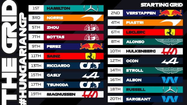 Mientras que en el puesto 12 saldrá Ocon, Daniel Ricciardo quien se reintegra a la Fórmula 1 y que tendrá su regreso a las pistas este domingo conduciendo para Alpha Romeo, largará en el puesto 13, mientras que Stroll será 14 y Gasly 15. Albon largará en 16 y Tsunoda en 17, en tanto que Russell será 18, Magnussen 19 y Sargeant 20. Así quedan las posiciones definidas para Gran Premio de Hungría.