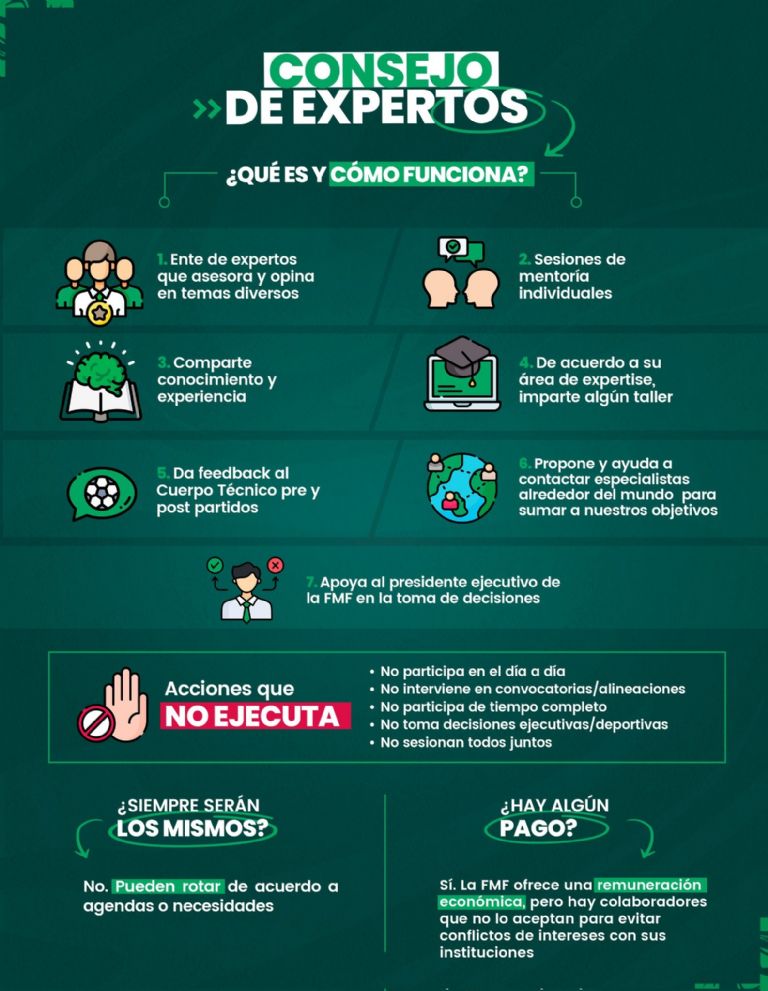 De acuerdo con la FMF la función de este consejo es asesorar y opinar en temas diversos, realizar sesiones individuales de mentoría, compartir su conocimiento y experiencia, impartir talleres de acuerdo con su área de especialidad, dar retroalimentación al cuerpo técnico de la Selección Mexicana antes y después de cada partido, ayudar a contactar a especialistas a nivel mundial que puedan asesorar a la FMF y a la Selección Mexicana y apoyar al presidente ejecutivo de la FMF (Ivar Sisniega) en la toma de decisiones.