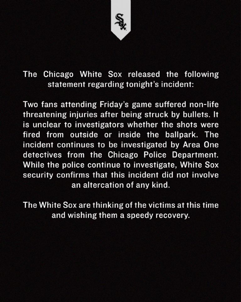 En tanto que los White Sox también se pronunciaron en un comunicado en el que descartaron que el incidente hubiera ocurrido como resultado de algún altercado al interior del estadio. “Mientras la policía sigue investigando, la seguridad de Medias Blancas confirma que este incidente no implicó ningún altercado de ningún tipo”, informó la organización sobre el incidente ocurrido la noche del viernes.