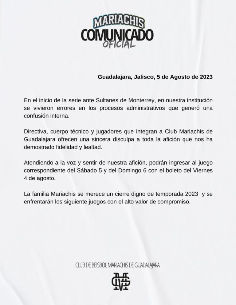 De acuerdo con el escrito hubo "errores en los procesos administrativos que generó una confusión interna", aunque sin aclarar puntualmente lo sucedido. La directiva se disculpó con sus aficionados e informaron que la entrada del viernes será válida para los juegos del sábado 5 y domingo 6 de agosto. Por su parte, la Liga Mexicana de Beisbol (LMB) también se pronunció respecto a lo ocurrido y confirmó que tanto jugadores como cuerpo técnico se negaron a jugar.