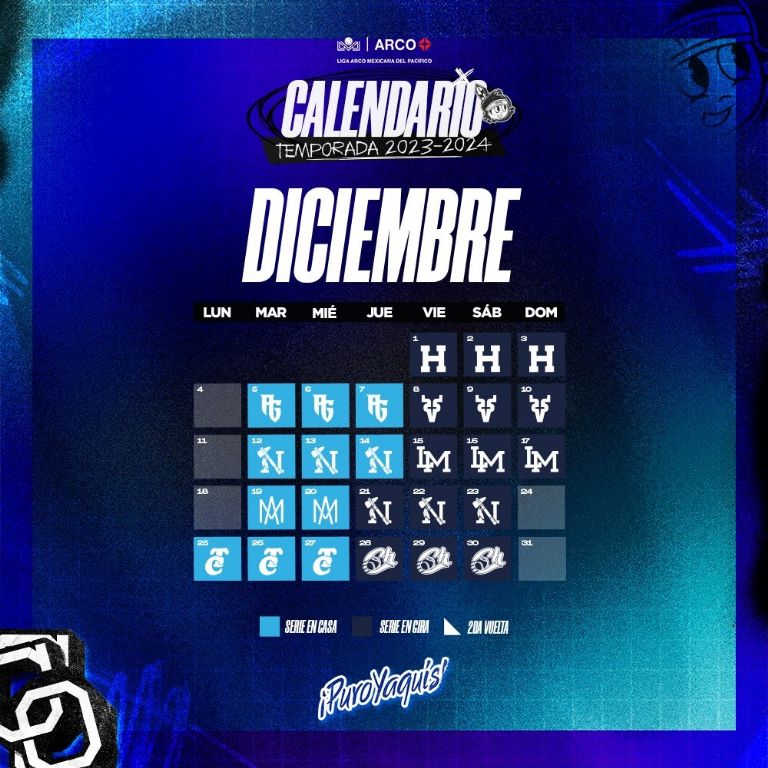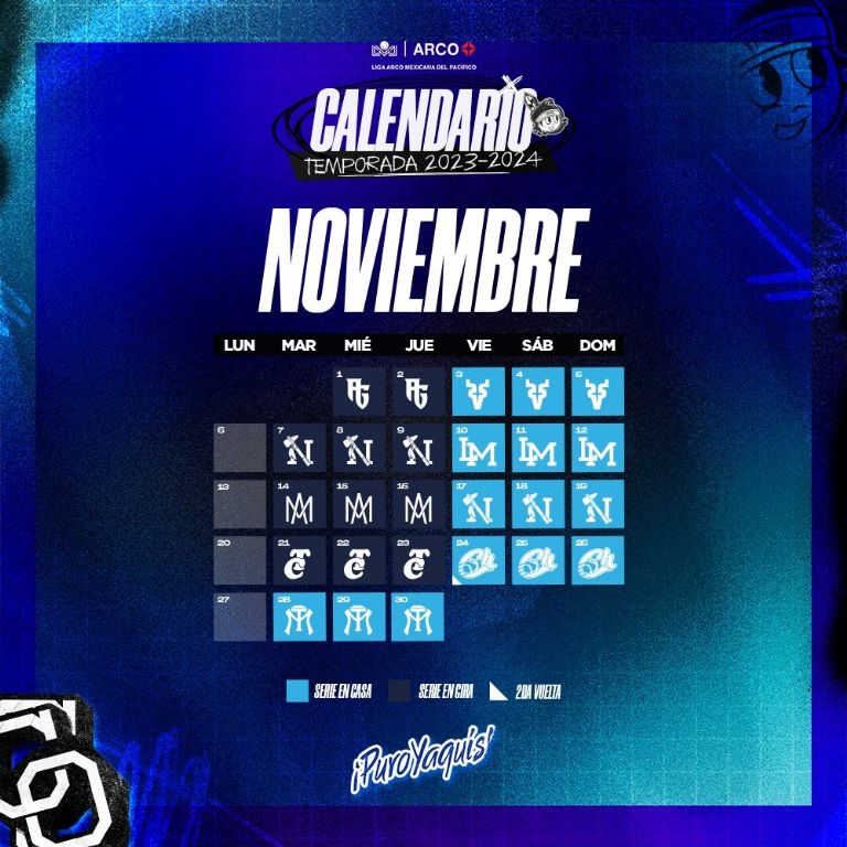 El 3, 4 y 5 de noviembre disputarán sus primeros enfrentamientos ante Venados de Mazatlán. En tanto que a los Mayos de Navojoa se medirán el 7, 8 y 9 del mismo mes. Jugarán contra Cañeros de Los Mochis el 10, 11 y 12, mientras que a Los Águilas de Mexicali los enfrentarán el 14, 15 y 16. Terminarán la primera vuelta del calendario ante los Tomateros el 23 de noviembre y nuevamente se medirán a los Charros de Jalisco el 24 de noviembre para empezar la segunda vuelta.