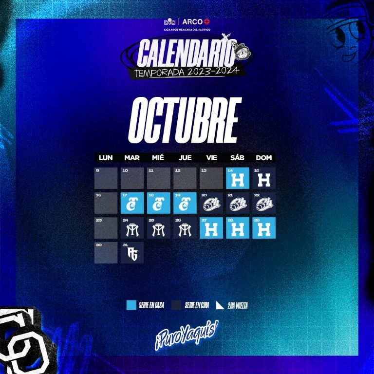 El 17, 18 y 19 de octubre tendrán su primera serie en el Estadio Yaquis ante los Tomateros de Culiacán. Mientras que su primer serie de visitante será ante los Charros de Jalisco el 20, 21 y 22. En el mismo mes se enfrentarán por primera vez en al temporada a los Sultanes de Monterrey el 24. 25 y 26. Mientras que enfrentarán la serie ante Naranjeros el 27, 28 y 29. Del 31 de octubre al 2 de noviembre se verán las caras por primera vez en la 2023-2024 ante los Algodoneros de Guasave en calidad de visitantes.