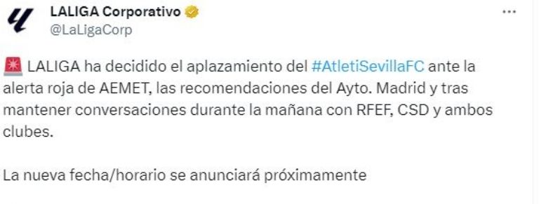 "Ante la situación climatológica excepcional en Madrid, tras los avisos de alerta roja por parte de AEMET y las recomendaciones del Ayuntamiento de Madrid, LALIGA, tras haber analizado la situación y mantenido conversaciones durante la mañana con el Presidente de la RFEF, el Presidente del Consejo Superior de Deportes y los consejeros delegados del Atlético de Madrid y el Sevilla FC, ha tomado la decisión de aplazar el encuentro entre el Atlético de Madrid y el Sevilla FC previsto inicialmente para hoy a las 18:30 en el Cívitas Metropolitano de Madrid", se lee en el comunicado.