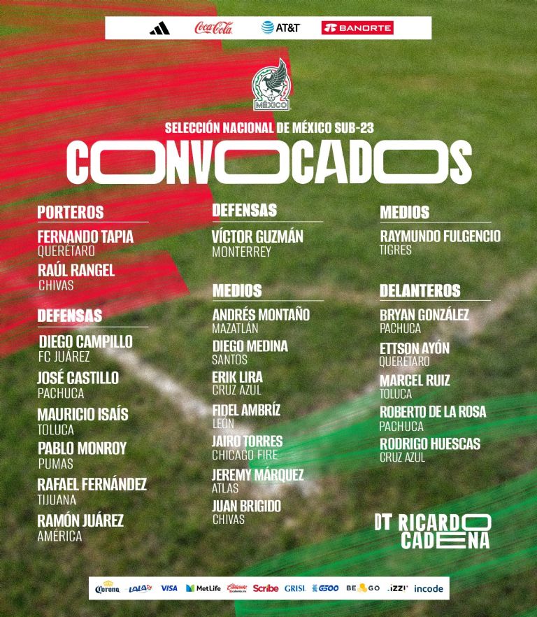 En ese último caso se encuentran jugadores como Víctor Guzmán, Marcel Ruiz o Erik Lira, además de Rafael Huescas. Del extranjero el único jugador considerado es Jairo Torres, quien milita en el Chicago Fire de Estados Unidos. Este equipo disputará dos juegos amistosos ante Colombia de la misma categoría. El primero de estos cotejos se realizará en el Estadio Tlahuicole en Tlaxcala a las 18:00 horas.