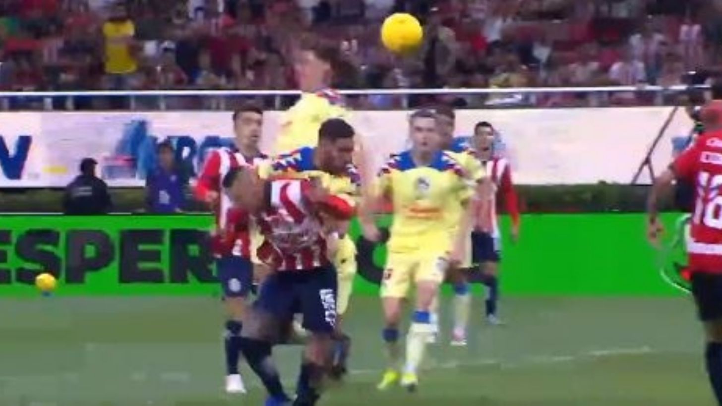 "El jugador número 25 de Guadalajara juega el balón con la pierna izquierda para continuar con su carrera hacia la portería contraria, en ese momento el defensa número cuatro de América bloquea el balón con su cabeza cambiando totalmente la dirección del balón y posteriormente se produce un contacto accidental del jugador número 25 de Guadalajara y el jugador número cuatro de América", se escucha en la explicación.