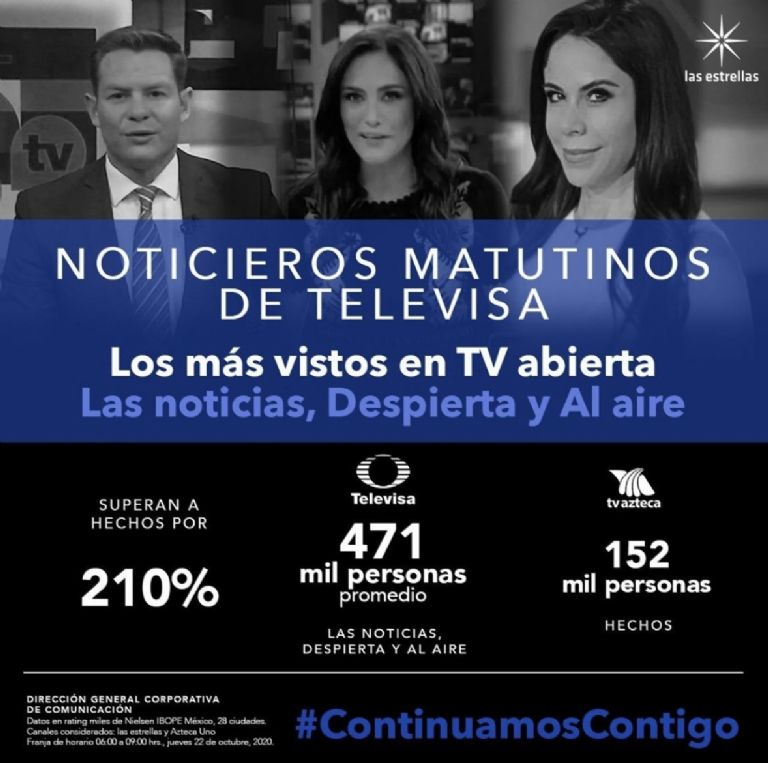 Gracias a tu preferencia, #LasNoticias con @carloshurtadooficial, #Despierta con @daniellemx_ y #AlAire con @paolarojas, se colocan como los noticieros matutinos más vistos en TV abierta, al superar a la competencia por 210 por ciento", escribió Televisa en su cuenta.