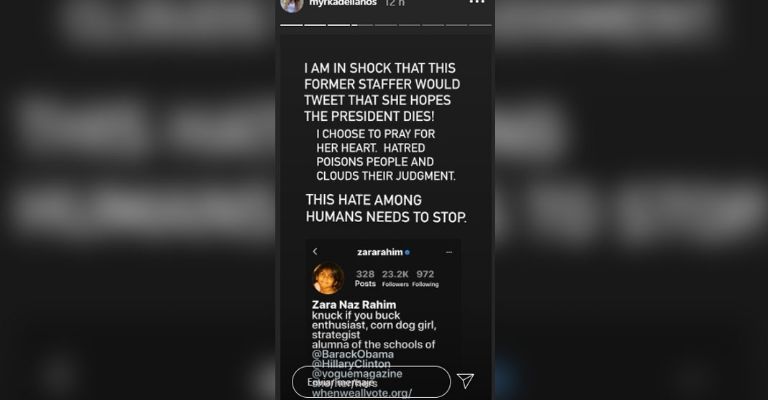 Dicho mensaje era dirigido a Zara Rahim, quien formó parte de las campañas de Hillary Clinton y, anteriormente, Barack Obama. A pesar de que sus tuits han sido borrados, Myrka opinó que: "Este odio entre los humanos tiene que parar".