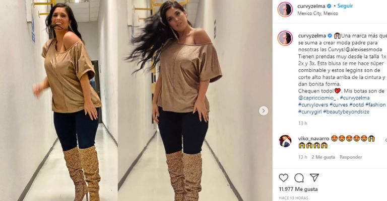 Se trata de un par de instantáneas en donde Curvy aparece modelando leggings de color negro, unas botas con print de leopardo así como una blusa beige de hombros caídos. Enormes aretes brillantes y el cabello con rizos.