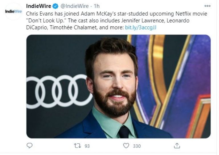 Chris Evans se ha unido a la próxima película de Netflix repleta de estrellas de Adam McKay Don't Look Up. El elenco también incluye a Jennifer Lawrence, Leonardo DiCaprio, Timothée Chalamet y más".