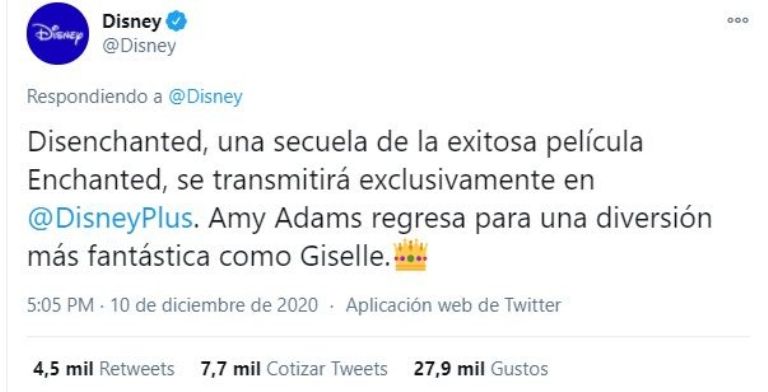 Estados Unidos.- La famosa actriz Amy Adams está oficialmente lista para volver al papel de la 'Princesa Giselle' en la futura secuela de la película Encantada, la cual, ha preocupado mucho a los fanáticos de la primera cinta, pues llevará el nombre de Desencantada y será estrenada por Disney Plus.