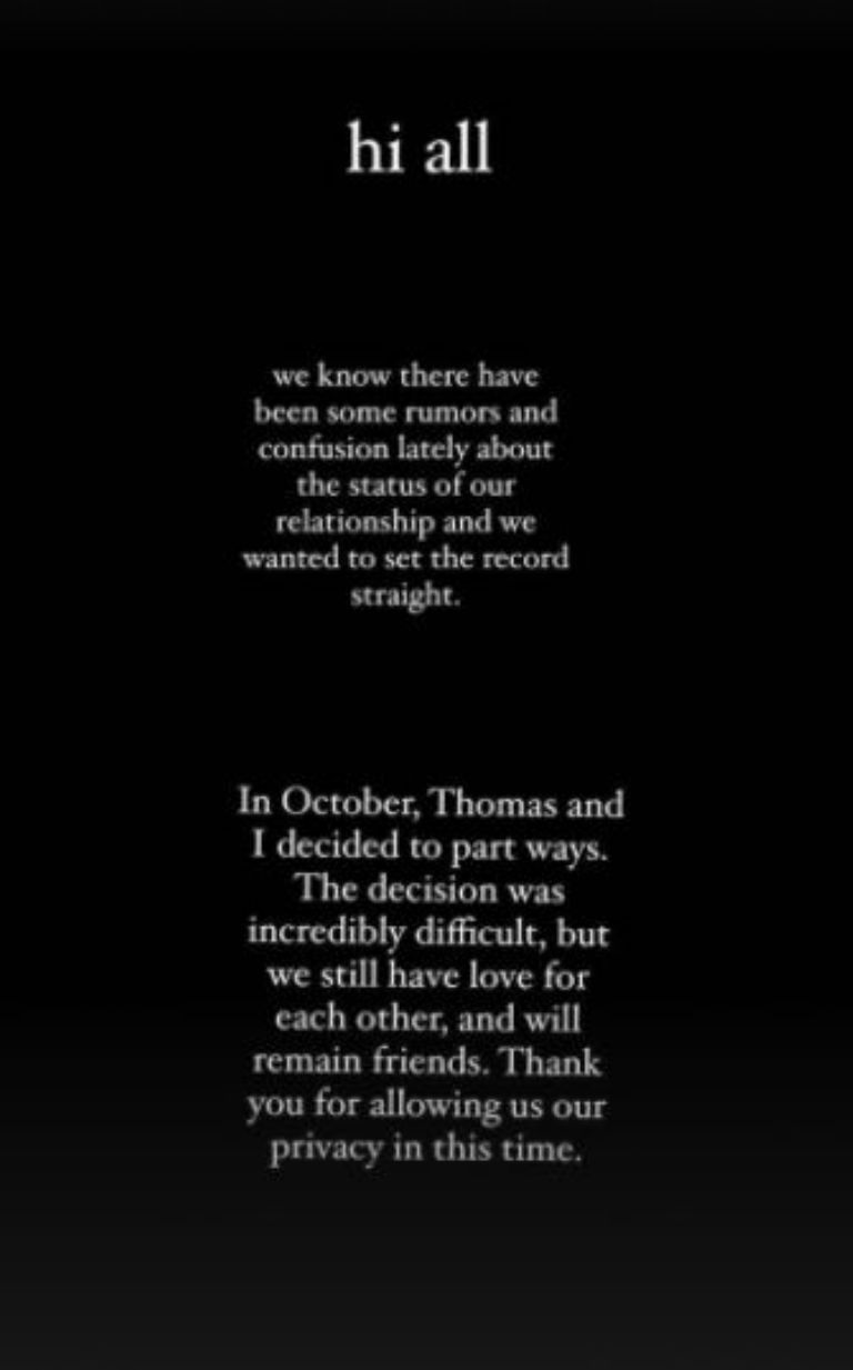 En octubre, Thomas y yo decidimos separarnos. La decisión fue increíblemente difícil, pero todavía nos amamos y seguiremos siendo amigos. Gracias por permitirnos nuestra privacidad en este momento".