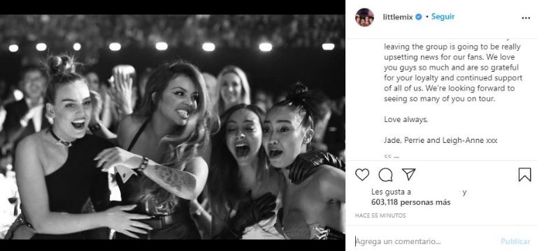 Después de 9 increíbles años juntos, Jesy ha tomado la decisión de dejar Little Mix. Este es un momento increíblemente triste para todos nosotros, pero apoyamos plenamente a Jesy. La queremos mucho y estamos de acuerdo en que es muy importante que haga lo correcto para su salud mental y su bienestar".