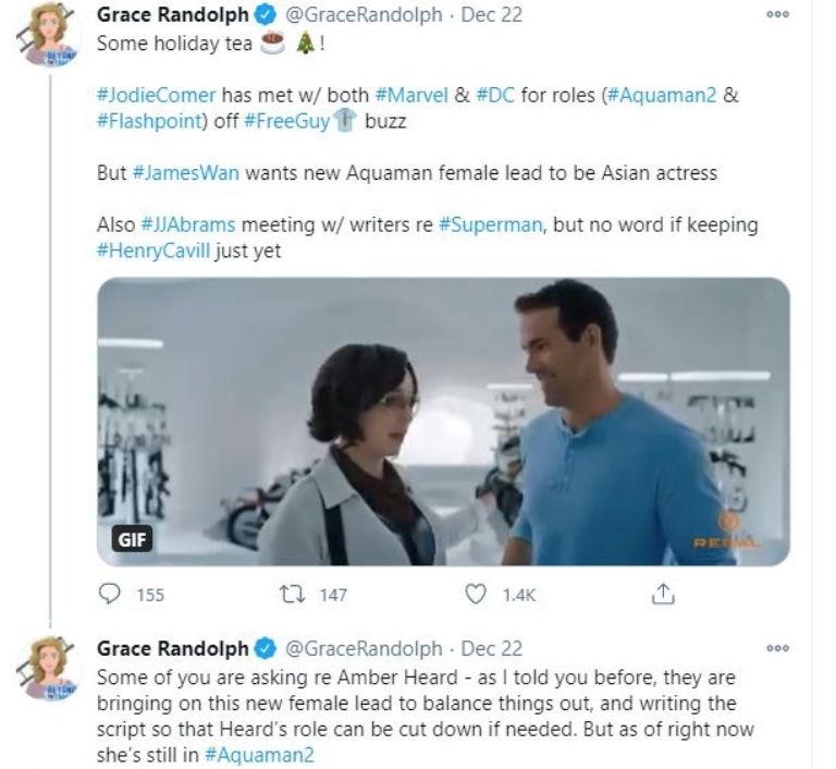 Algunos de ustedes están preguntando a Amber Heard. Como les dije antes, están contratando a esta nueva protagonista femenina para equilibrar las cosas y reescribiendo el guion para que el papel de Heard pueda reducirse si es necesario. Pero de momento ella todavía está en Aquaman 2".
