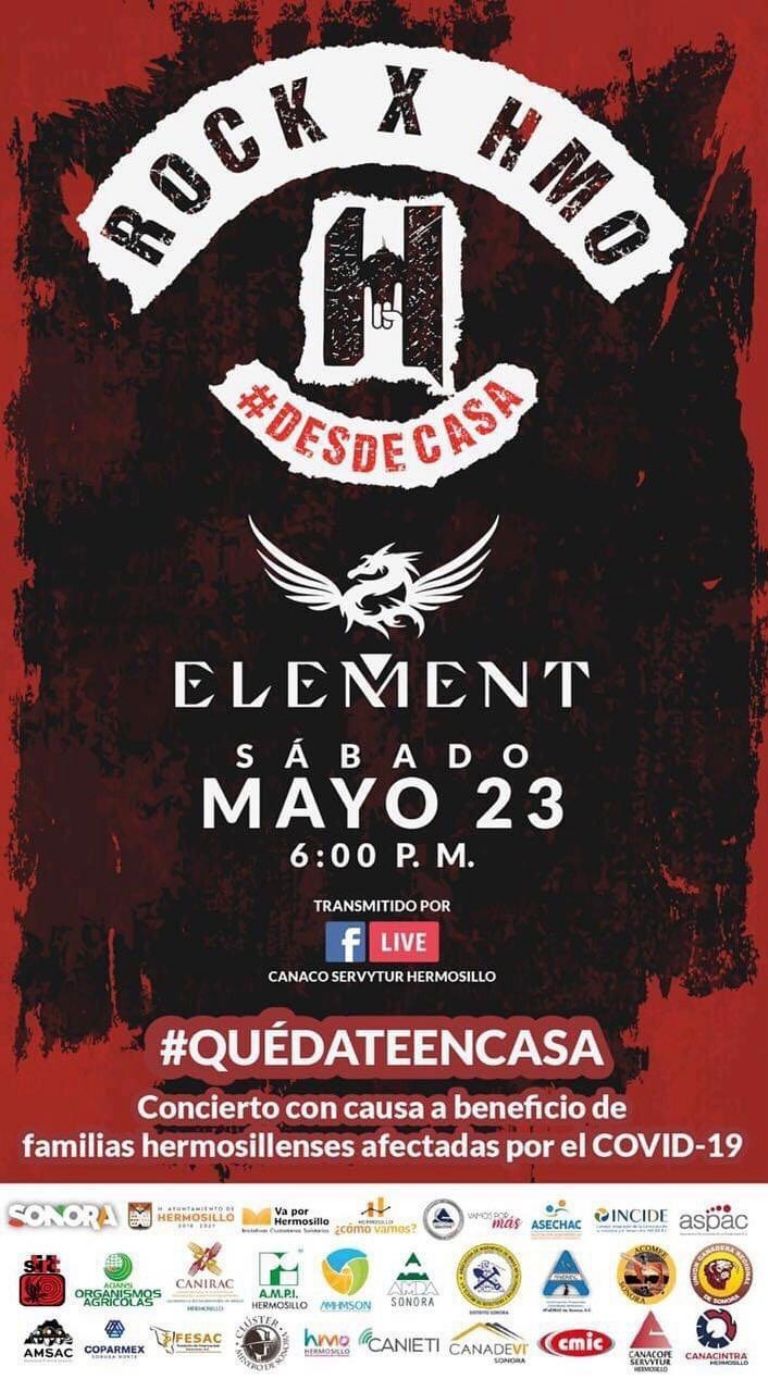 Hermosillo, Sonora.- Con la finalidad de apoyar a las familias afectadas en el aspecto económico y en salud por la pandemia de COVID-19, la banda de rock Element ofrecerá concierto y se transmitirá en redes sociales.