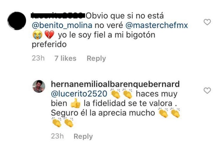 En un comentario que dejó una seguidora de la competencia, expresó que no vería MasterChef si no estaba Benito, a lo que Hernán contestó contundente. dejando entrever que efectivamente, el chef Benito Molina no regresará al programa del Ajusco.