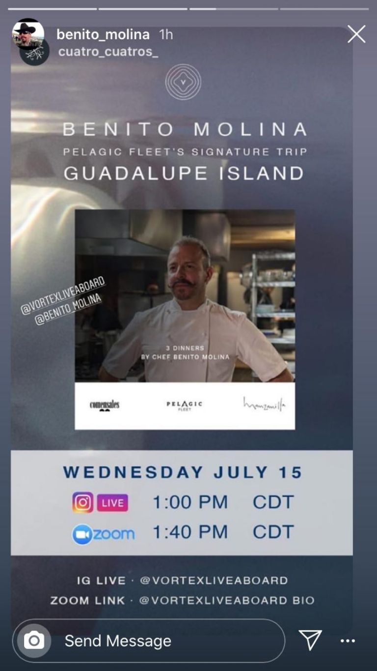 Ya que los mariscos y pescados son su especialidad, al parecer estará colaborando con Cuatro Cuatros y transmitiendo por Instagram y Zoom algunas recetas. Molina se encuentra viviendo en Ensenada, Baja California.