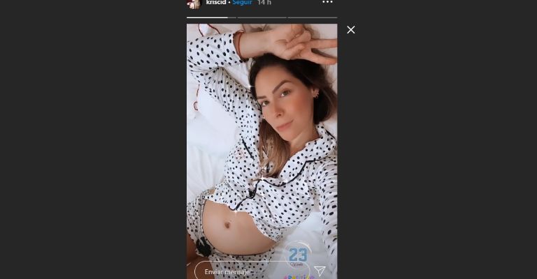 A través de sus Historias de Instagram, la también presentadora publicó una selfie en la que luce su pancita a sus 23 semanas de embarazo, imagen a la que agregó un emoji con el texto "pensamientos positivos".