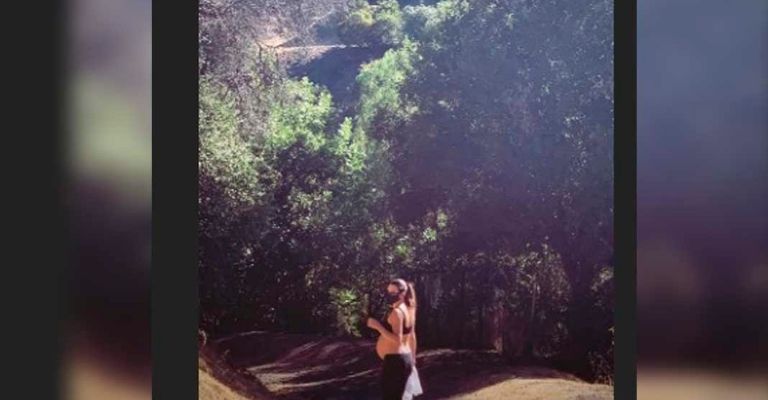 La tercera fotografía muestra a Michele caminando por un sendero y permite apreciar su avanzado embarazo. La actriz aparece portando un 'oufit' deportivo de top y pantalón, lo cual deja al descubierto su abultada pancita, además de que también utiliza un cubrebocas.